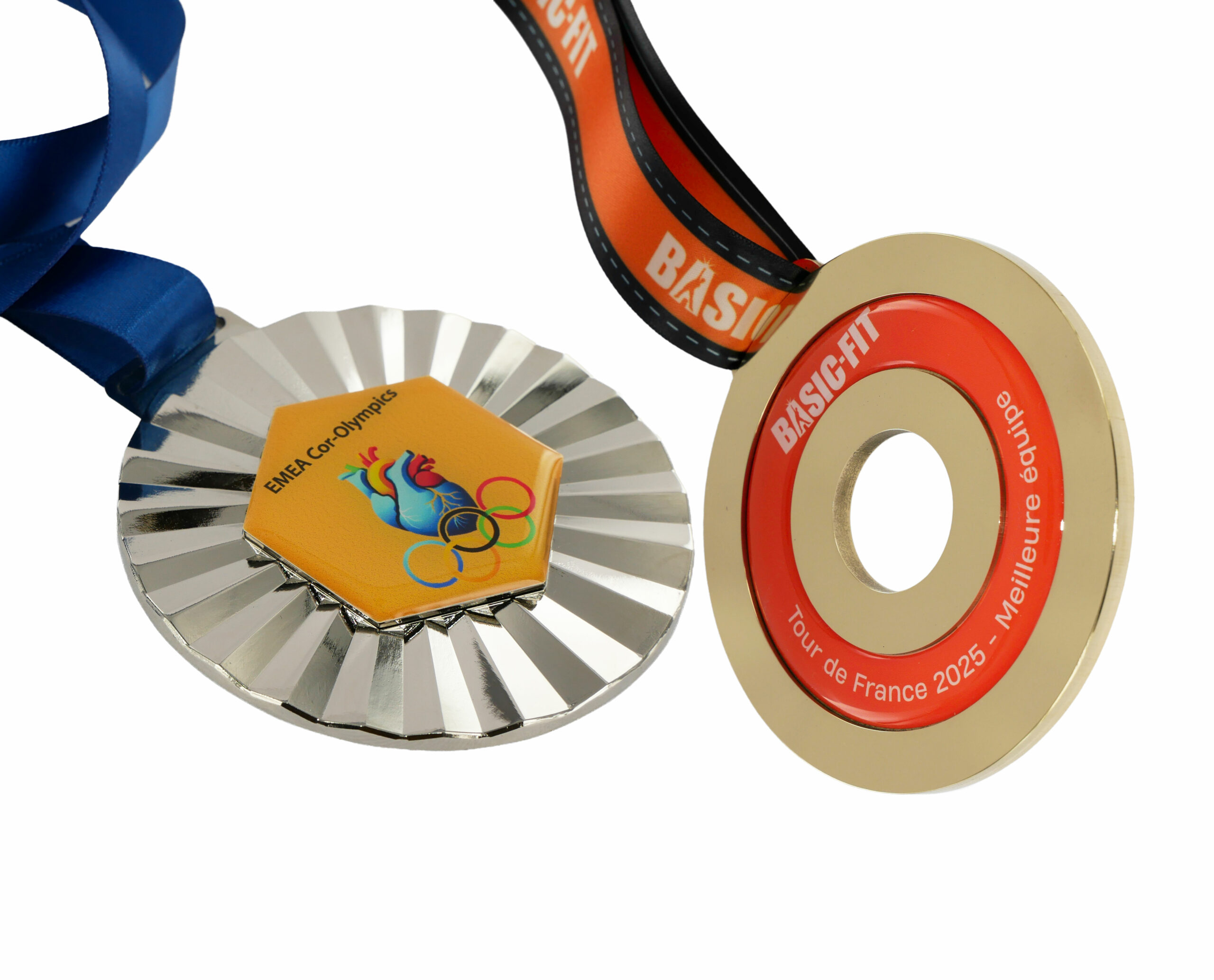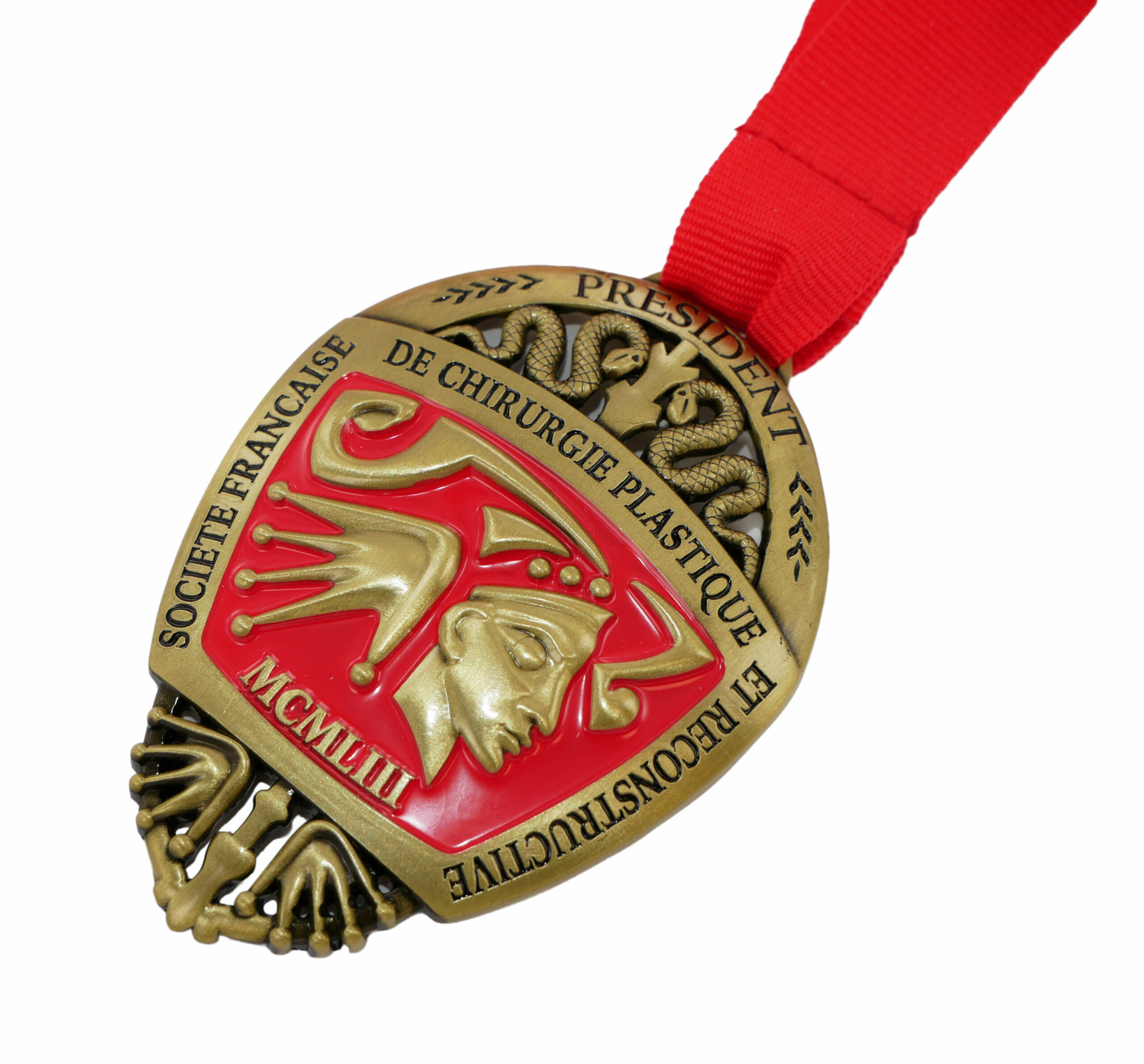 Médaille en laiton Laiton poli mains 90 x 4 mm Marquage quadri et époxy. Découpée à la forme et évidée. Ruban polyester. Médaille en zamac 70 x 6 mm Effet bombé. Finition doré mat. Attache ruban polyester. Médaille Bureau 90 x 100 x 8 mm 416 Grs Combinaison : médaille + socle en zamac. Emaillé 2 couleurs. Chromé brillant. Médaille « création » 80 x 60 x 3 mm Vieux bronze. Découpée et évidée et mise en relief. Émaillé 1 couleur. Ruban polyester.