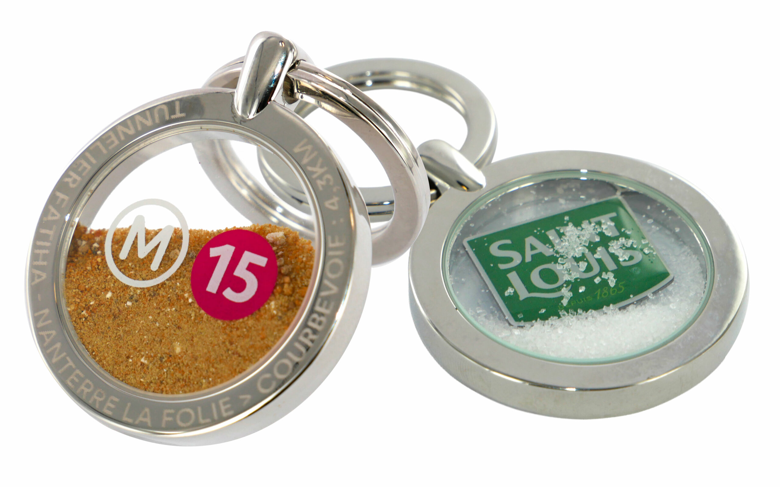 Porte-Clés Salsa Tournant Diamètre 3 cm Logo dansant émaillé 1 couleur. Billes de verre. 2 verres minéraux + 2 joints toriques. Porte-Clés Salsa Diamètre 3cm et 4 cm Impression numérique sur verre ou motif métal découpé émaillé. Insertion matière client (sable) ou (billes de verres). 2 verres minéraux + 2 joints toriques. Gravure laser pourtour recto. Porte-Clés Salsa Tube Insertion matière client Tube PVC Calotte métal + charm’s quadri. Porte-Clés Salsa Tube étanche Insertion matière client Tube en verre. Calotte métal + charm’s marquage en creux.